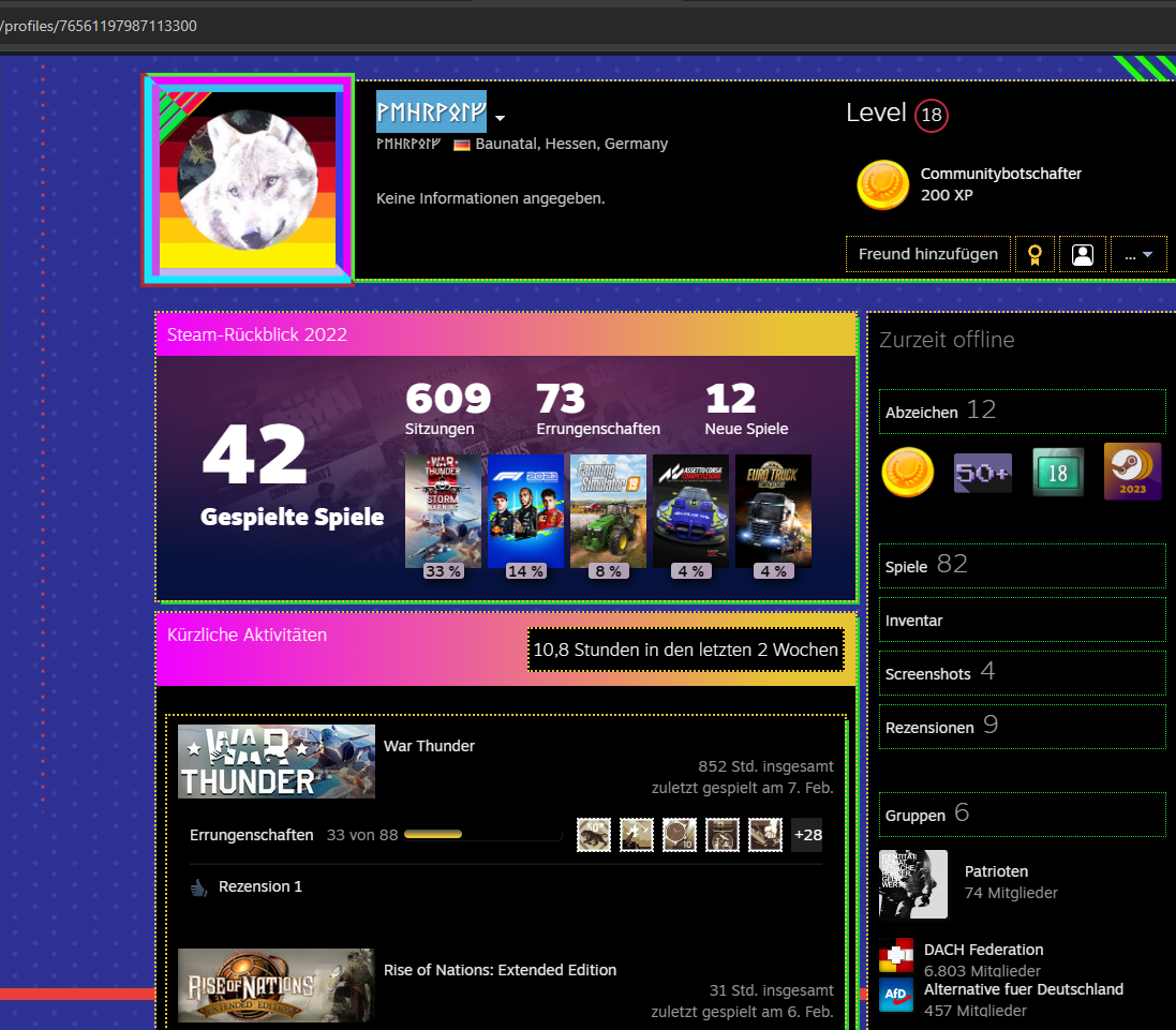 Ruhnen Name Bedeutet übersetzt "Wehrwolf" was eine Rechtsrock Band und NS Organisation sein kann. Dazu Mitgliedschaft in diversen Gruppen mit NS Bezug, und "Stolzmonat" Profilbild. Daher genug Dinge um ein Rechtsextremes Weltbild zu unterstellen.