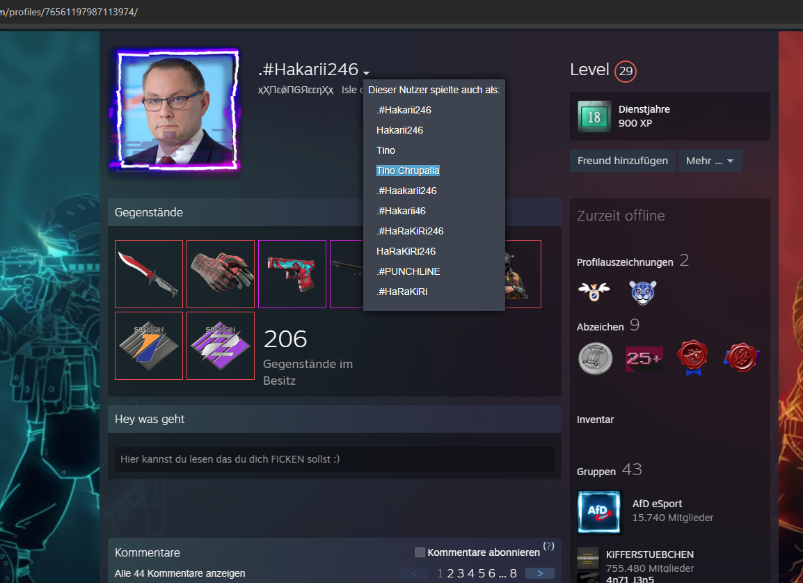 Der Name "Tino Chrupalla" könnte auf eine Verbindung zu einer bekannten rechtsextremen Person hindeuten (Tino Chrupalla ist ein deutscher Politiker der AfD). Die Zugehörigkeit zu Gruppen wie "AfD eSport" deutet auf eine mögliche Unterstützung von rechtsextremen Ideologien hin.
