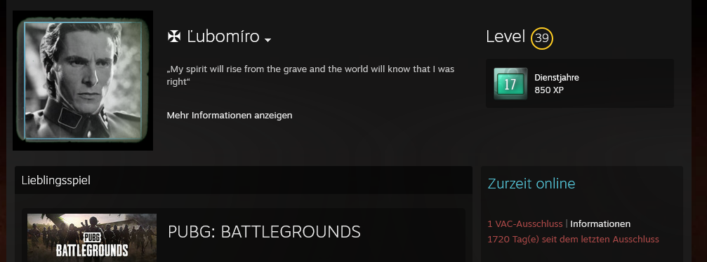 PB ist Patrick Bateman (Christian Bale) in einer SS uniform, Ebenso steht ein zitat in englisch von Adolf Hitler auf dem Profil.