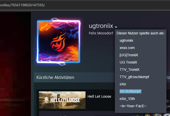 Verwendung von "SS" im Spielernamen "SS-SchlumpF", was auf eine positive Assoziation zur SS (Schutzstaffel) hinweisen kann, einer paramilitärischen Organisation des nationalsozialistischen Regimes.