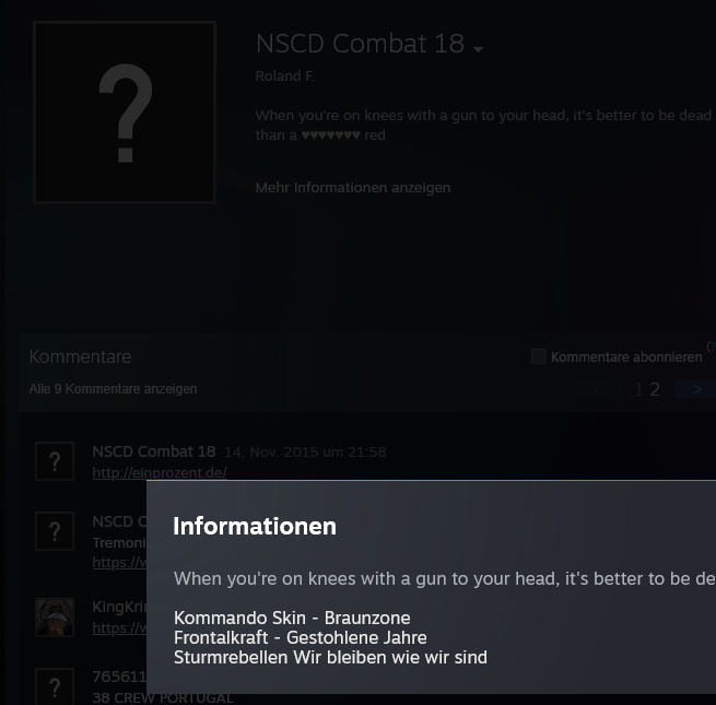 Aktueller Name sowie Namenshistorie sowie Mitglied in Rechten Steamgruppen und im Infotext verlinkungen zu Rechten liedern