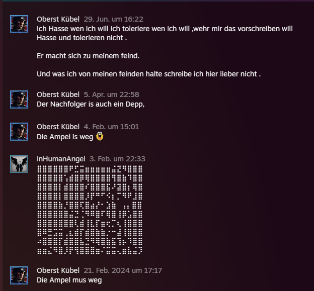 Verwendung von hasserfüllten Äußerungen ("Ich hasse wen ich will, ich toleriere wen ich will"), die eine intolerante Haltung andeuten.