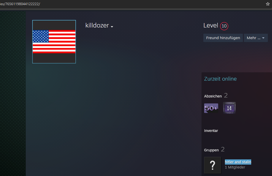 Der Nutzer hat sich als Mitglied in einer Gruppe mit dem Namen "hitler and stalin" identifiziert, was auf eine problematische Ideologie hinweist.