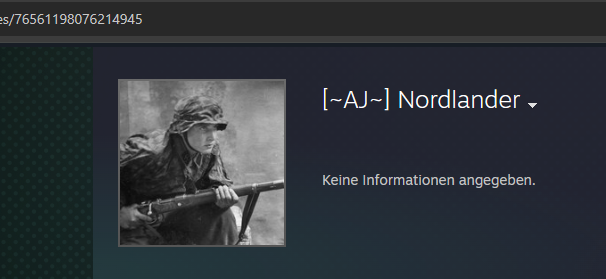 Name könnte auf SS Division anspielen (https://de.wikipedia.org/wiki/11._SS-Freiwilligen-Panzergrenadier-Division_%E2%80%9ENordland%E2%80%9C), SS auf Profilbild. ANMERKUNG: Mit dem Clantag [~AJ~] sind bereits mehrere durch Rechtsextremissmus aufgefallen.