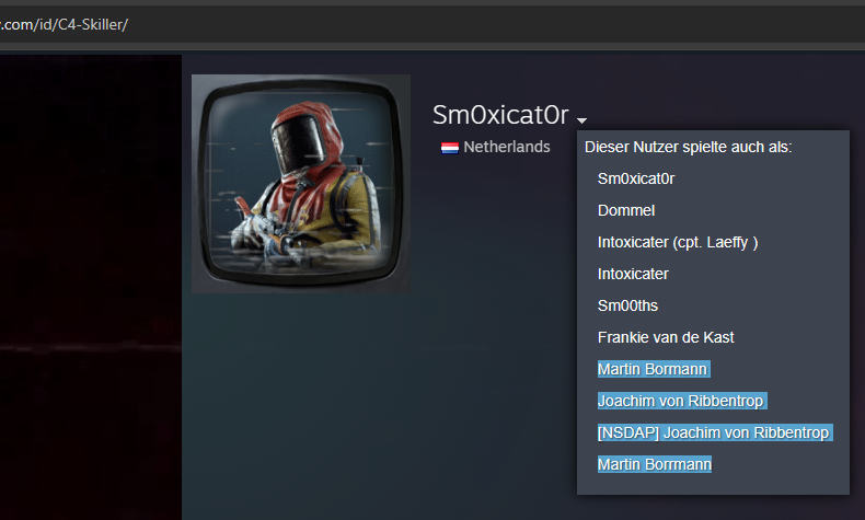 Verwendung von Namen historischer Persönlichkeiten, die für ihre Rolle im Nationalsozialismus bekannt sind (Martin Bormann, Joachim von Ribbentrop). Präsenz von [NSDAP] im Namen, was die Zugehörigkeit zu einer rechtsextremistischen Ideologie anzeigt.