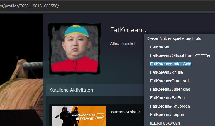 Verwendung des Aliases "FatKorean#JudenGold"/"FatKorean#Judenkind", was eine antisemitische Konnotation hat und auf Judenfeindlichkeit hinweist.