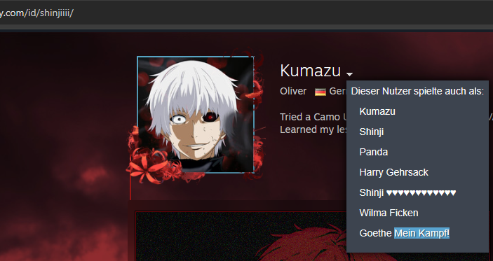 Der Spieler hat "Mein Kampf" als Namen verwendet, was eine direkte Verbindung zu rechtsextremistischen Ideologien und der NSDAP herstellt.