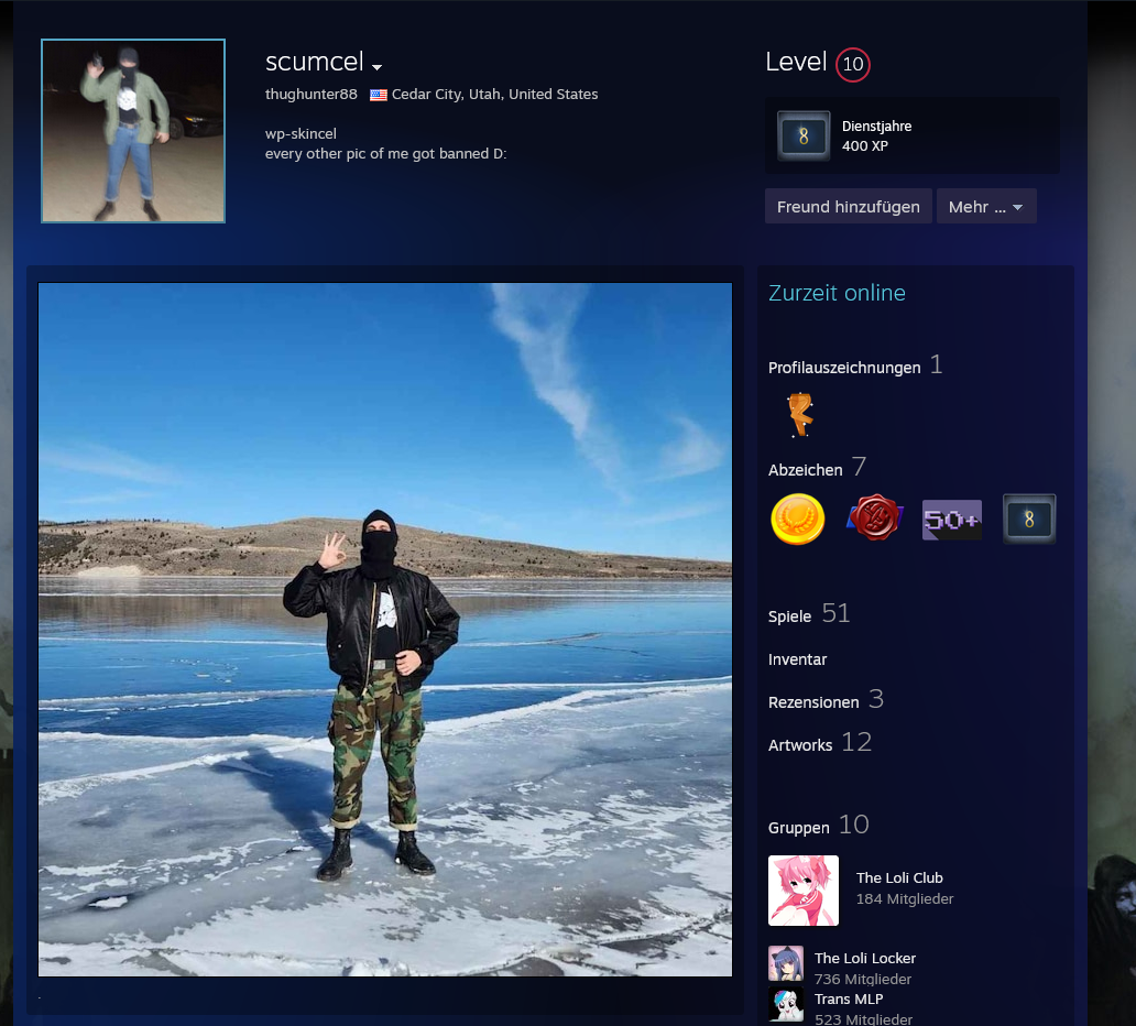 Trägt auf seinen Bildern im Profil ein Shirt mit SS Totenkopf ansonsten sehr rassistischer Mensch
