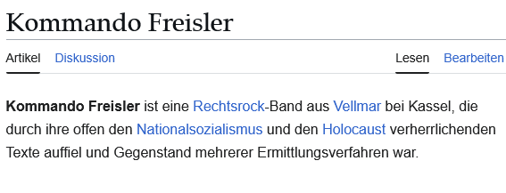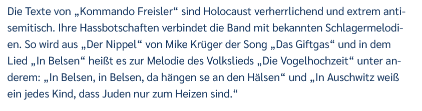 - Der Text in der Infobox Stammt aus einen Lied von Kommando Freisler - in Belsen Melodie Stammt aus dem Kinderlied "Die Vogelhochzeit" Quelle : https://www.belltower.news/rechtsextreme-bands-kommando-freisler-33256/