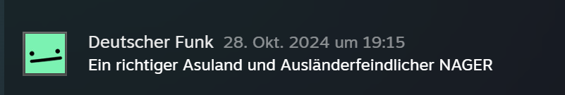 Kommentar auf Steam "Diese Person gehört an die Wand gestellt." Gehört zu "Deutscher Funk"
