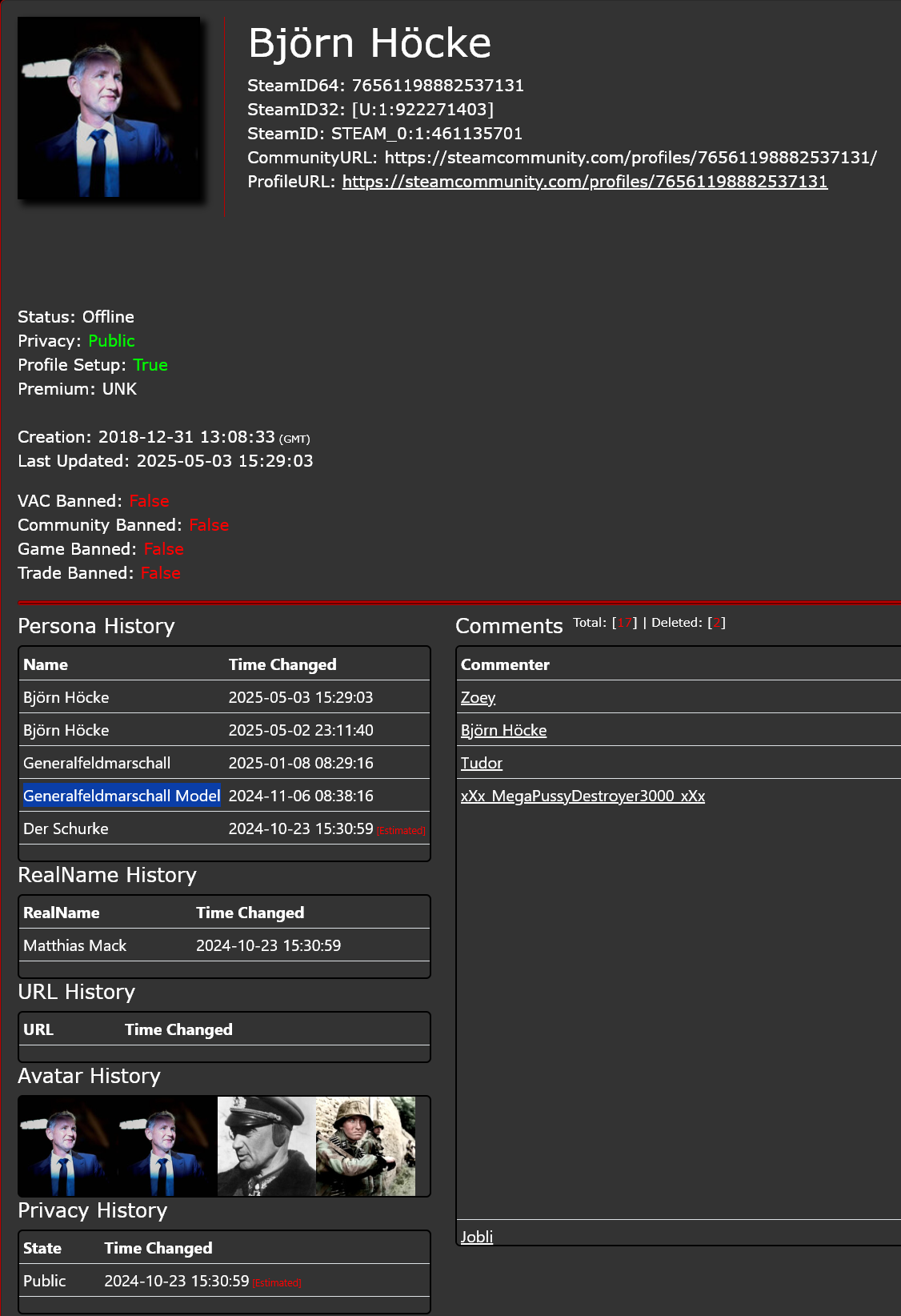 Spielername "Generalfeldmarschall Model" , war "Hitlers Feuerwehrmann" und Kriegsverbrecher. Aktuell "Björn Höcke" mit Bild und Heiligenschein, sowie einschlägige Profilbeschreibung: