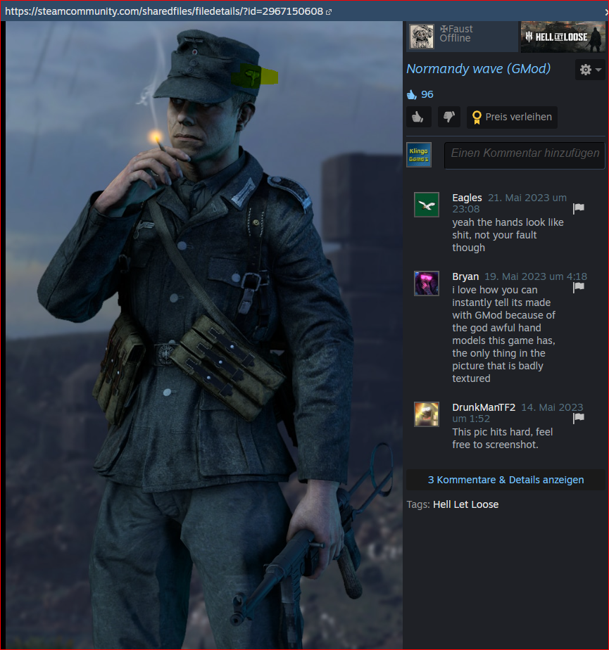 Postet Artwork zu HLL mit Wehrmacht Soldaten der ein SS Adler an der mütze hat (was Historisch schwachsinn ist, und es daher nur darum geht nen SS Symbol zu verwenden)