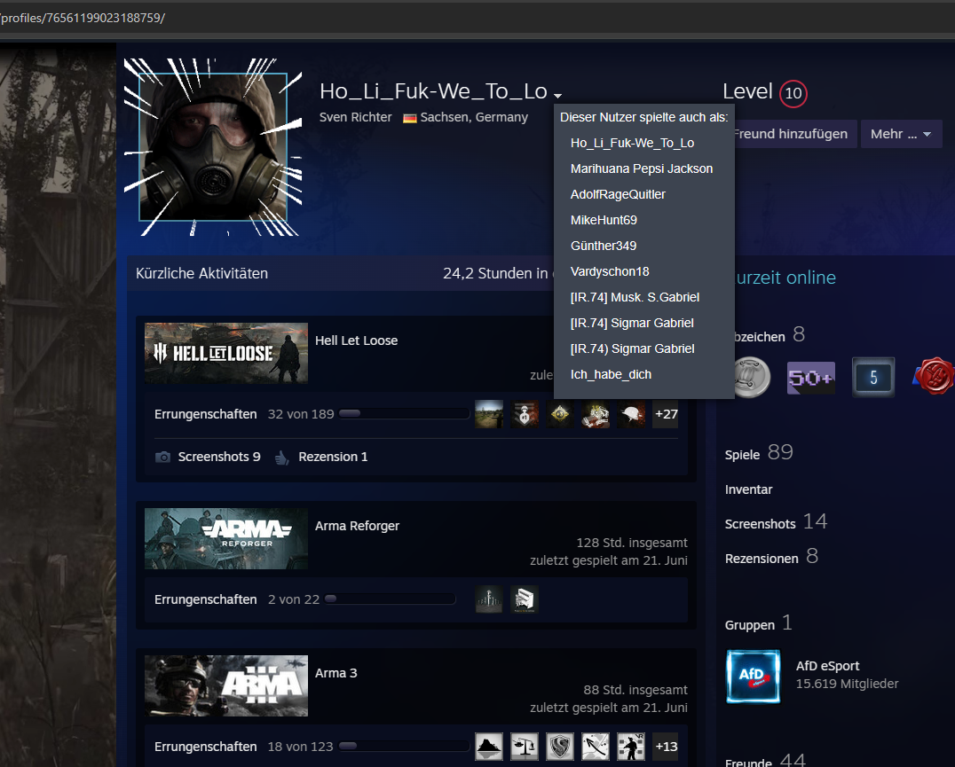 Der Spieler ist Mitglied in einer Gruppe namens "AfD eSport", was auf eine Verbindung zur rechtsextremen politischen Partei AfD hindeutet.