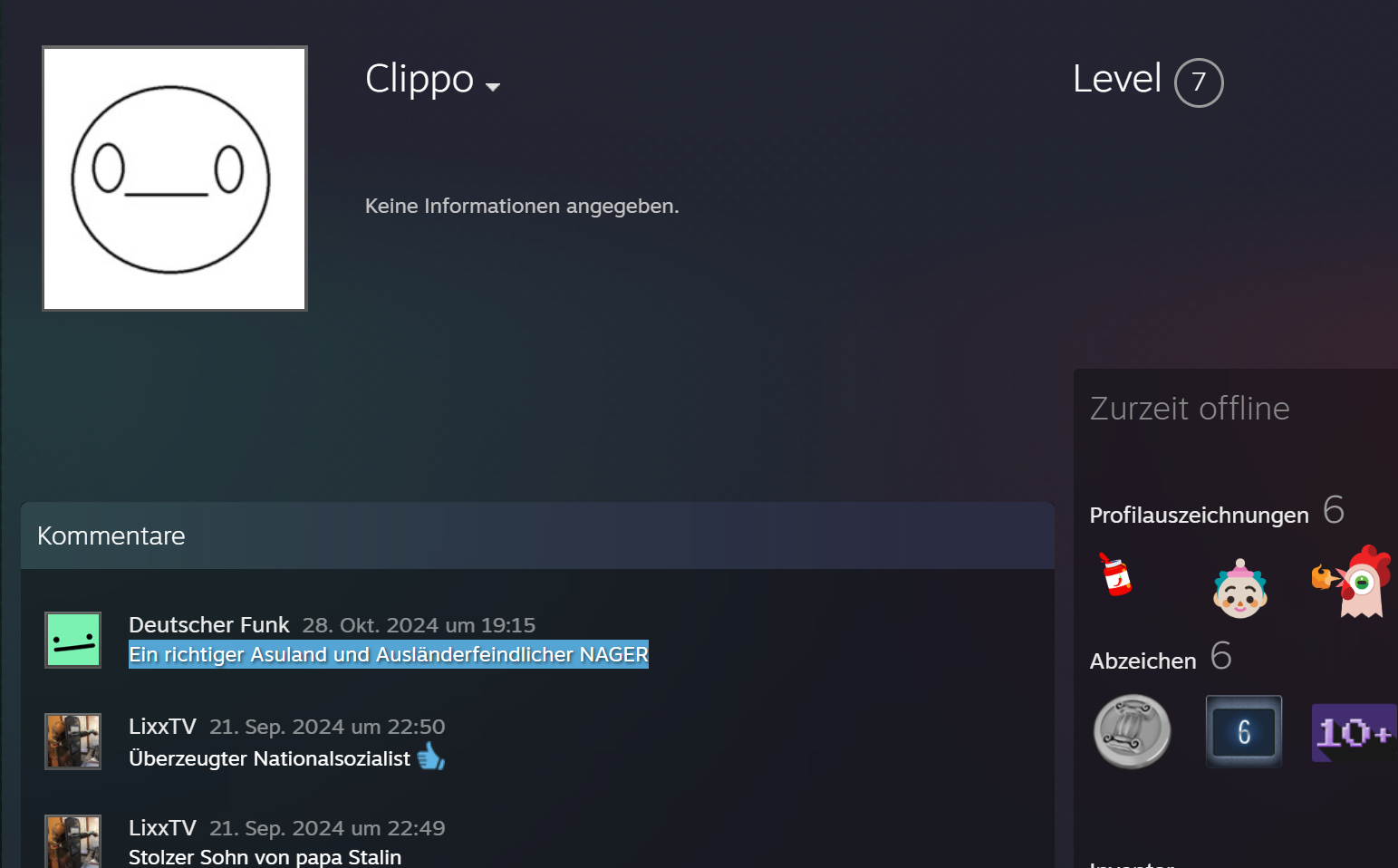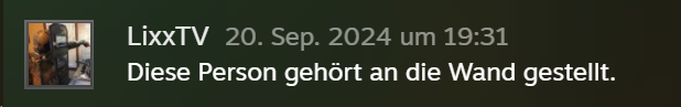 Kommentar auf Steam "Diese Person gehört an die Wand gestellt." Gehört zu "Deutscher Funk"