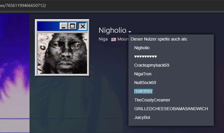 Nutzung des Benutzernamens "HailHittler", der eindeutig eine Verherrlichung des Nationalsozialismus darstellt. Verwendung rassistischer Begriffe wie "Niga" in mehreren Benutzernamen, was auf eine diskriminierende Gesinnung hinweist.