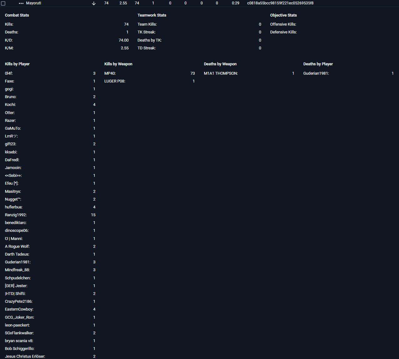16491057 2025-03-25T21:05:45.904510 2025-03-25T21:05:42 c0818a55bcc98159f221ec05269535f8 Mayorutl 76561197993083037 huflerbua [1.66 sec (1742936742)] KILL: Mayorutl(Axis/c0818a55bcc98159f221ec05269535f8) -> huflerbua(Allies/76561197993083037) with MP40 1 KILL 1 MP40